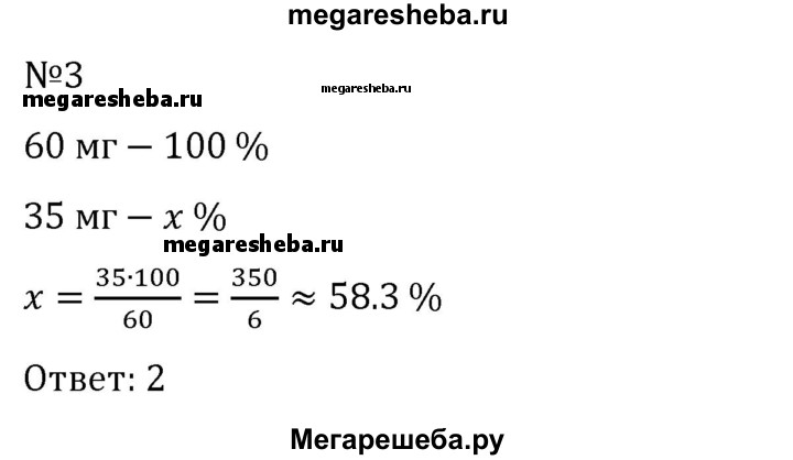 3. Дневная норма потребления витамина С составляет 60 мг. Один мандарин в среднем содержит 35 мг витамина С. Сколько примерно процентов дневной нормы витамина С получил человек, съевший один мандарин? 1) 170 % 2) 58 % 3) 17 % 4) 0,58 %