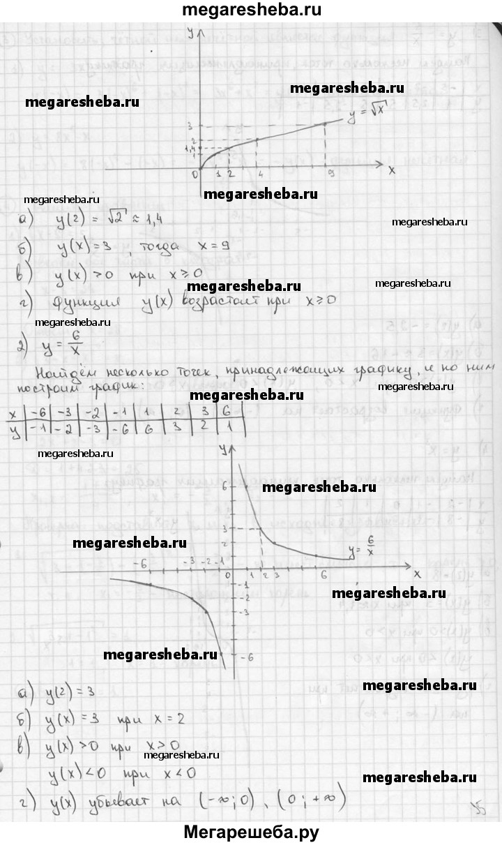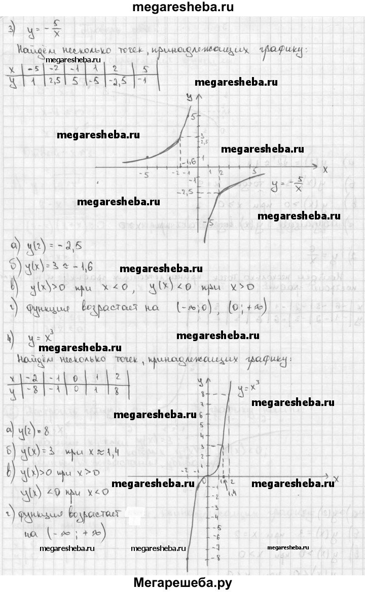 2. Построить график функции: 1) у = √х; 2) y = 6/x; 3) у = -5/x; 4) у = х^3. Для каждой функции по графику найти: а) у (2); б) значение х, если у (х) = 3; в) промежутки, на которых у (х) > О, у(х) < 0; г) промежутки возрастания, убывания.