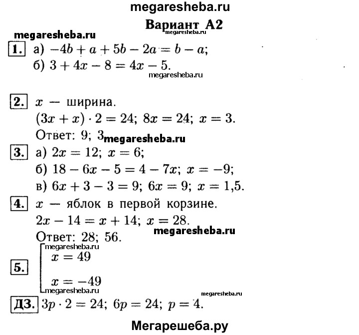 Вариант А2 Упростите выражения: а) -(4b - а) + (5b - 2а); б) 3 + 4(х - 2). Периметр прямоугольника равен 24 см. Его ширина в 3 раза меньше длины Найдите длину и ширину прямоугольника. Решите уравнения: а) 8х - 15,3 = 6х - 3,3; б) 18 - (6х + 5) = 4 - 7х; в) 6(х + 0,5) -3 = 9. В первой корзине в 2 раза меньше яблок, чем во второй. Когда из второй корзины переложили в первую 14 яблок, то в обеих корзинах яблок стало поровну. Сколько яблок было в каждой корзине первоначально? Решите уравнение: |х| = 49. Дополнительное задание Найдите значение р, при котором число 2 является корнем уравнения 3рх = 24.