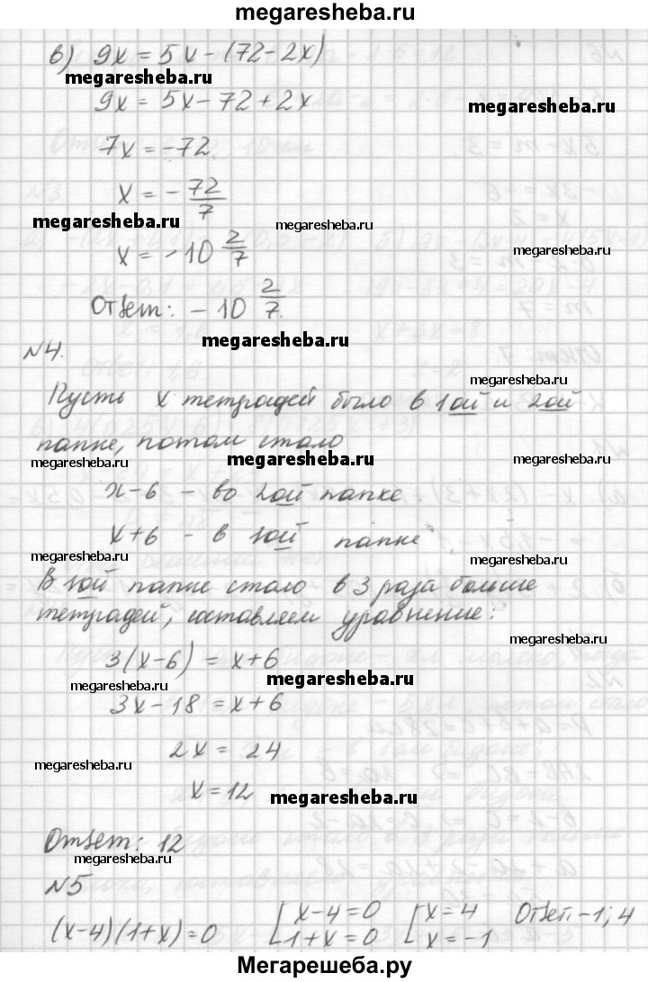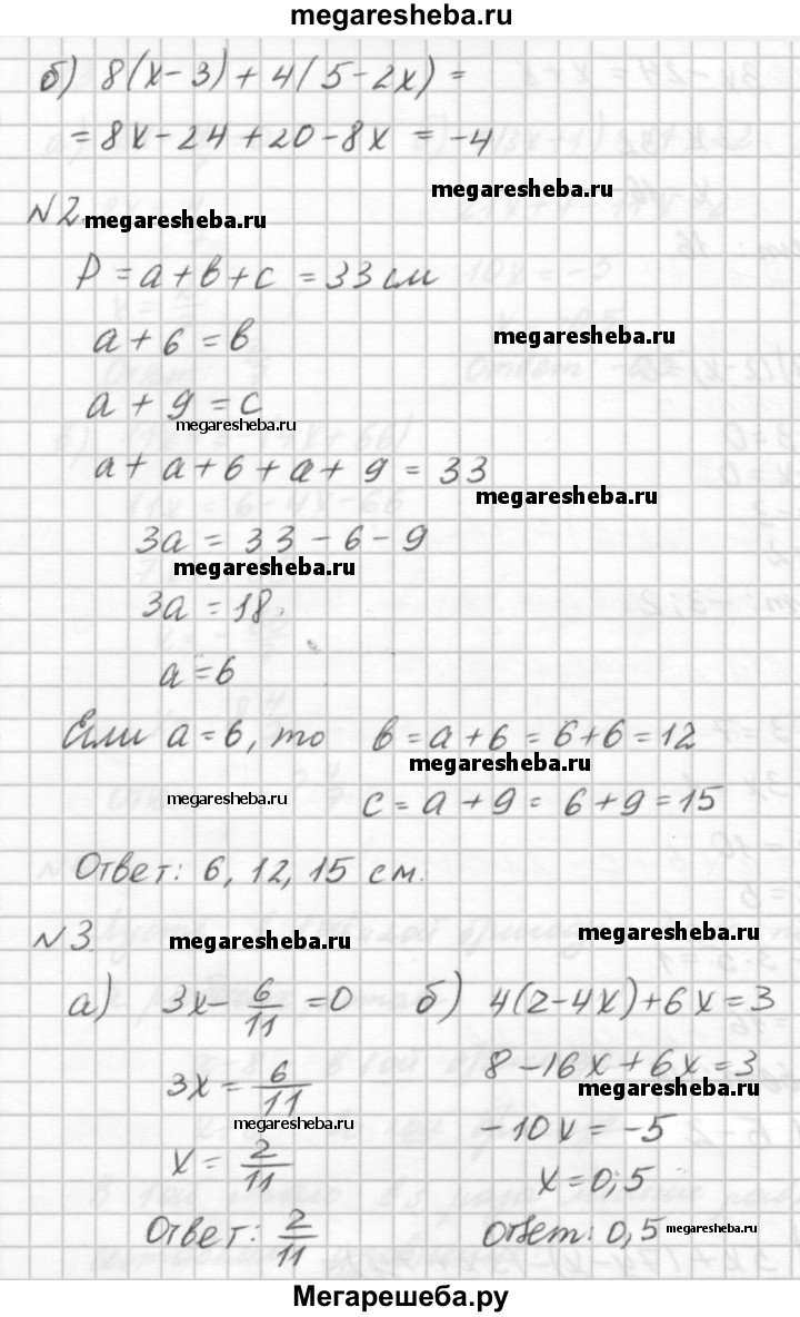 Вариант Б2 Упростите выражения: а) 5х + (7у - х) - (Зх + 7у); б) 8(х - 3) + 4(5 - 2х). Одна из сторон треугольника на 6 см меньше другой и на 9 см меньше третьей. Найдите стороны треугольника, если его периметр равен 33 см. Решите уравнения: а) Зх – 6/11= 0; б) 4(2 - 4х) + 6х = 3; в) 9х = 5х - (72 - 2х). В двух папках было одинаковое количество тетрадей. После того, как из второй папки переложили в первую 6 тетрадей, в первой папке тетрадей стало в 3 раза больше, чем во второй. Сколько тетрадей было в каждой папке первоначально? Решите уравнение: (х - 4)(1 + х) = 0. Дополнительное задание Найдите значение m, при котором имеют общий корень уравнения 5 - Зх = -1 и 5х - m. = 3.