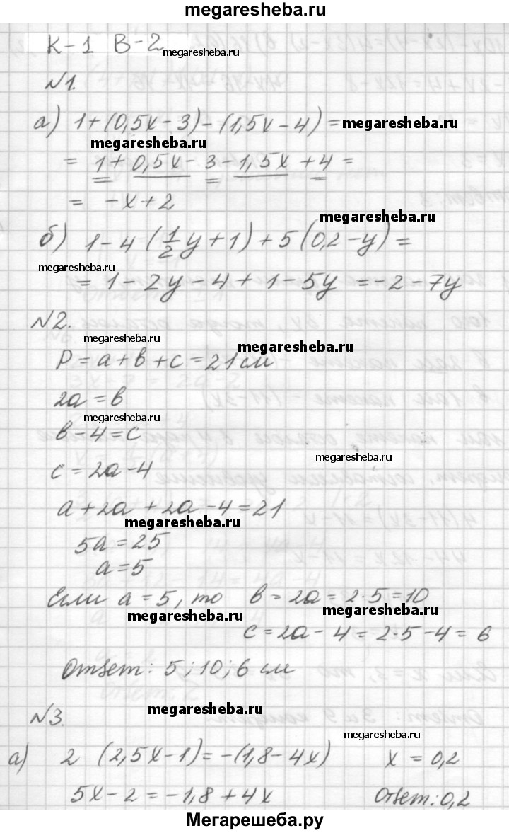 Вариант В2 а) 1 +(0,5х- 3)- (1,5х- 4); б) 1 – 4(1/2y + 1) +5(0,2 – y). 2. Периметр треугольника ABC равен 28 см. Сторона ВС в 2 раза больше стороны АВ, а сторона АС на 2 см меньше стороны ВС. Найдите стороны треугольника. Периметр треугольника ABC равен 21 см. Сторона АВ в 2 раза меньше стороны СВ, а сторона СВ на 4 см больше стороны АС. Найдите стороны треугольника. 3. Решите уравнения: а)-(2х+ 0,1) = 3(0,5-х); б) 19x - (3x - 4) = 4(5x - 1); в) 4(0,25x - 6) = 8(0,125x + 3). а) 2(2,5х - 1) = -(1,8 - 4х); б) 10x - (2x - 4) = 4(3x - 2); в) 16(0,25x - 1) = 5(0,8x - 3,2). 4. В первом бидоне в 5 раз больше молока, чем во втором. После того, как из первого бидона перелили во второй 5 литров, в первом бидоне стало в 3 раза больше молока, чем во втором. Сколько литров молока было в каждом бидоне первоначально? В двух пакетах было по 11 конфет. После того, как из первого пакета взяли в 3 раза больше конфет, чем из второго, в первом пакете осталось в 4 раза меньше конфет, чем во втором. Сколько конфет взяли из каждого пакета? 5. Решите уравнение: (|x| + 2)(|x| - 3) = 0. (4+ |x|)(|x| - 1) = 0. Дополнительное задание Найдите значение а, при котором имеют общий корень уравнения 5x-1 = 2а-2 и 3x + 2 = а + 5. . 2x+1 = а + 5 и 3x - 7 = 2а - 2