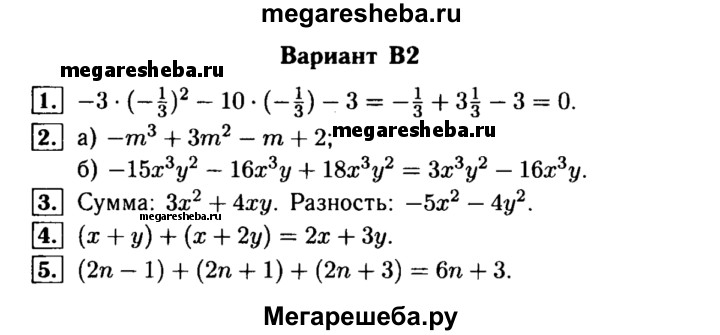Вариант В2 1. Является ли число – 1/3 корнем уравнения -3x2 – 10x- 3 = 0? 2. Приведите к стандартному виду многочлены. 3. Найдите сумму и разность многочленов: -x2 + 2xy – 2y и 4x2 ++ 2xy + 2y2. 4. В первый день пути турист прошел х км, а в каждый последующий день проходил на у км больше, чем в предыдущий. Запишите в виде выражения, какое расстояние прошел турист за второй и третий день вместе.? 5. Докажите, что сумма трех последовательных нечетных чисел кратна 3.