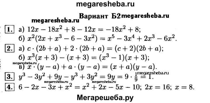 Вариант Б2 1. Упростите выражения: а) (6х + 4)(2 - Зх); б) х2(х - 3)(2 + х2). 2. Разложите на множители: а) 2be + ас + 6b + За; б) х4 + 3х3- х - 3; в) ху - а2 - ах + ау. 3. Упростите и вычислите при у = 1/9: у3 - (3у + у2)(у - 3). 4. Решите уравнение: (2 – x)(3 - х) = (х + 2)(х - 5).