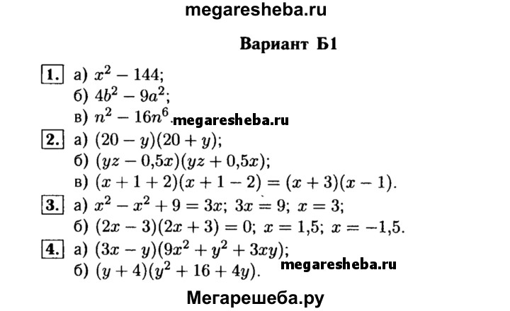 Вариант Б1 1. Упростите выражения: а) (х - 12)(х + 12); б) (За + 2b)(2b - За); в) (-4n3 + n)(n + 4n3). 2. Разложите на множители: а) 400 - у2-, б) -0,25х2 + у2z2; в) (х + 1)2 - 4. 3. Решите уравнения: а) х2 - (х + 3)(х - 3) = 3х; б) 4х2 - 9 = 0. 4. Представьте в виде произведения: а) 27х3 - у3; б) у3 + 64.