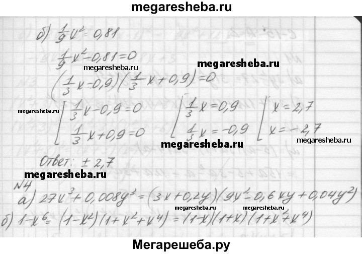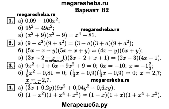Вариант В2 1. Упростите выражения: а) (10х + 0,3)(0,3 - 10х); б) (7а - Зb)(-1а – 3b); в) (х2 + 9) (х + 3) (х - 3). 2. Разложите на множители: а) -а4 + 81; б) 25х2 - (х + у)2; в) (3х - 2)2 - (х + 1)2. 3. Решите уравнения: а) (3х +1)2 - 9(х + 1)(х -1) = 0; б) 1/9х2 =0,81. 4. Представьте в виде произведения: а) 27х3 + 0,008у3; б) 1 - х6.