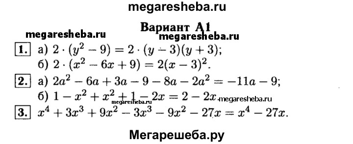 Вариант А1 1. Разложите на множители: а) 2у2 - 18; б) 2х2 - 12х + 18. 2. Упростите выражения: а) (2а + 3)(a - 3) - 2а(4 + а); б) (1 - х)(х + 1) + (х - 1)2. 3. Докажите тождество: - 2 7х = (х2 - Зх)(х2 + Зх + 9).