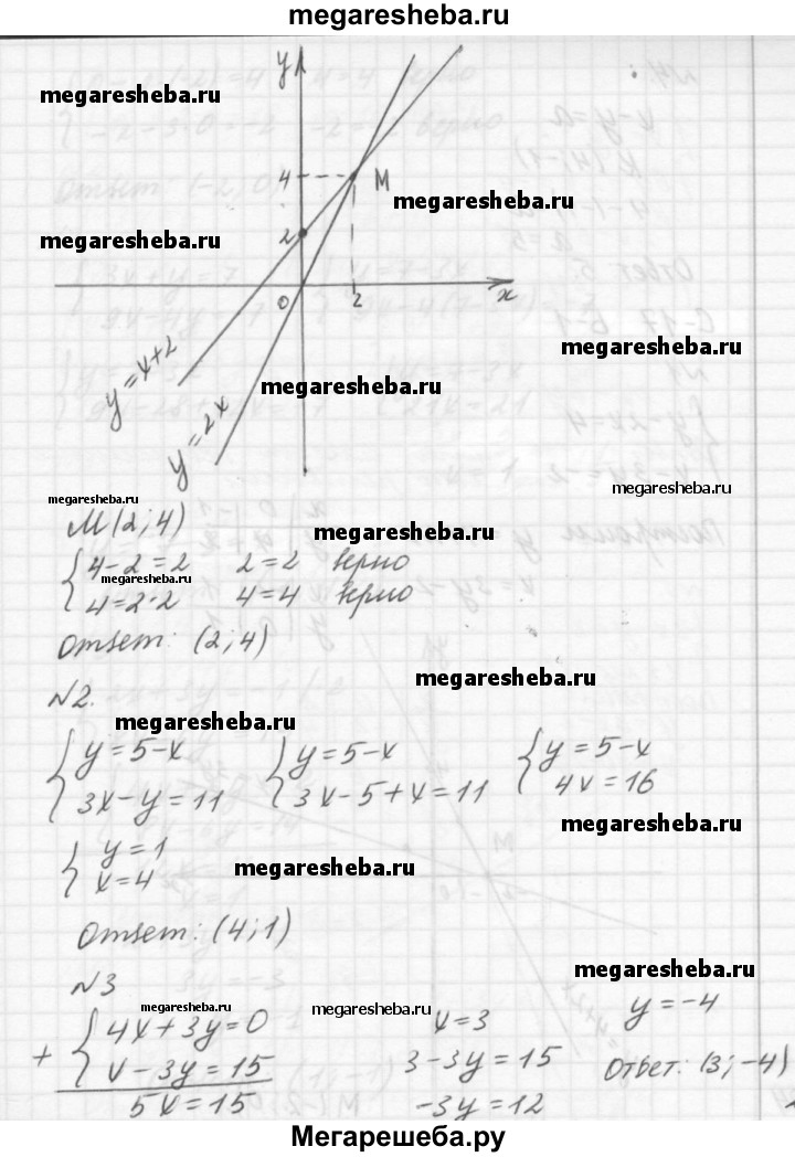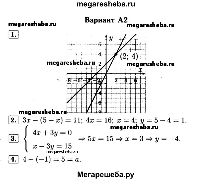 Вариант А2 1. Решите графически систему уравнений. Выполните проверку, подставив найденные решения в уравнения системы: {y-2=2x; y=2x 2. Решите систему способом подстановки: {y=5-x; 3x-y = 11 3. Не выполняя построений, найдите координаты точки пересечения графиков уравнений: 4х + 3у = 0 и х - 3у = 15.? 4. График уравнения х - у = а проходит через точку К(4; -1). Найдите число а.