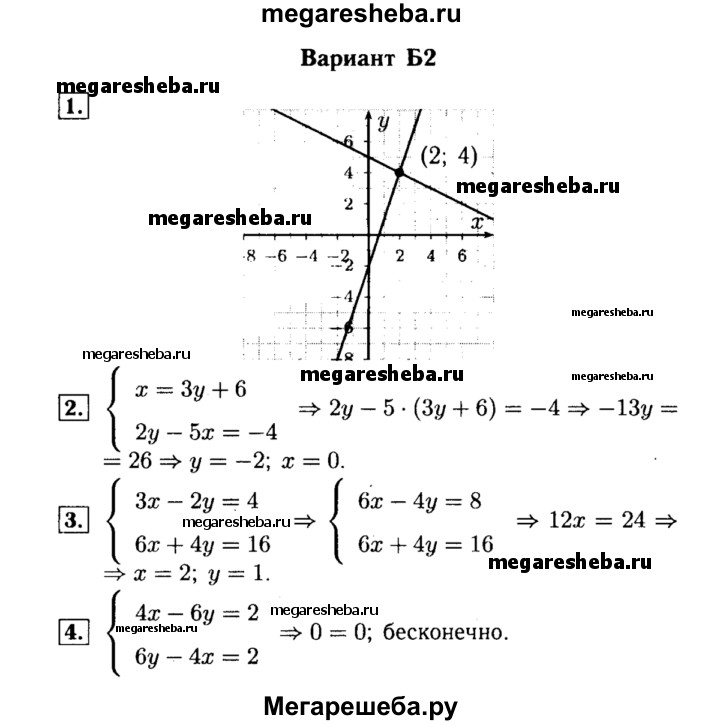 Вариант Б2 1. Решите графически систему уравнений. Выполните проверку, подставив найденные решения в уравнения системы: {3х -у = 2; х + 2у = 10. 2. Решите систему способом подстановки: {3x- 3у = 6; 2у -5х = -4 3. Не выполняя построений, найдите координаты точки пересечения графиков уравнений: 3х - 2у = 4 и 6х + 4у = 16. 4. Определите, имеет ли данная система решения и сколько: {4x -6у = 2; 3у -2х = 1.