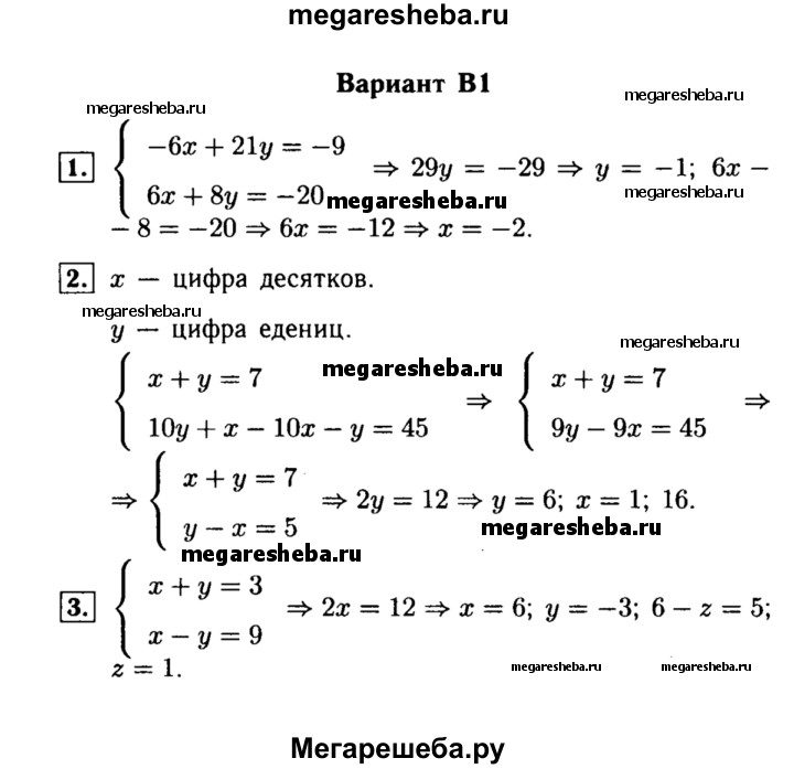 Вариант В1 1. Решите систему способом сложения: {2х -7у = 3; Зх + 4у = -10. 2. Решите задачу с помощью системы уравнений. Сумма цифр двухзначного числа равна 7. Если эти цифры поменять местами, то получится число, большее данного на 45. Найдите данное число. 3. Решите систему: {х + у = 3, z-у = 4, x - z = 5.