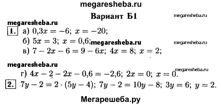 Вариант Б1 Решите уравнения: а) 0,3х + 8 = 2; б) 4 - х = 1 + 4х; в) 7 - 2(х + 3) = 9 - 6х; г) 4(х - 0,5) - 2(х + 0,3) = -2,6. При каком значении у значение выражения Ту - 2 больше значения выражения 5y - 4 в 2 раза?