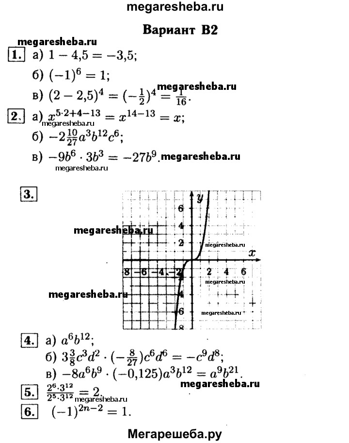 Вариант В2 1. Вычислите. 2. Выполните действия. 3. Постройте график функции y = х2. Найдите все значения k, при которых точка A(k; 1) принадлежит данному графику. 4. Упростите выражения: 5. Используя свойства степени, найдите значение выражения: 18^6/32•27^4 6. Упростите выражение: (-1)2n:(-1):(-1), где n — натуральное число.
