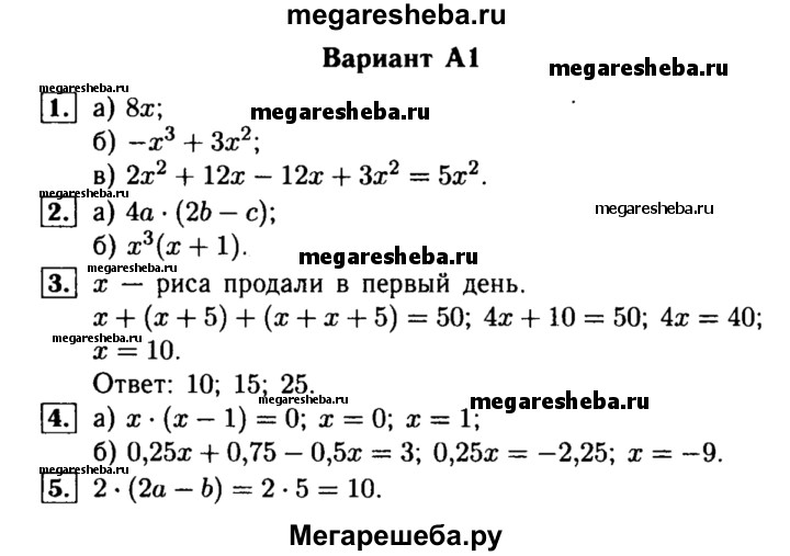Вариант А1 1. Выполните действия: а) (х2 + 4х) - (х2 - 4х); б) -x(х2 – 3x); в) 2х(x + 6) - 3х(4 - x). 2. Вынесите общий множитель за скобки: а) 8ab - 4ас; б) х4 + х3. 3. За три дня продано 50 кг риса. В первый день продано на 5 кг меньше, чем во второй, а в третий столько, сколько в первый и второй вместе. Сколько риса продано в каждый из дней? 4. Решите уравнения: а) х2 - х = 0; б) x+3 / 4 – x/2 =3 5. Известно, что 2а - b = 5. Вычислите 4а – 2b.