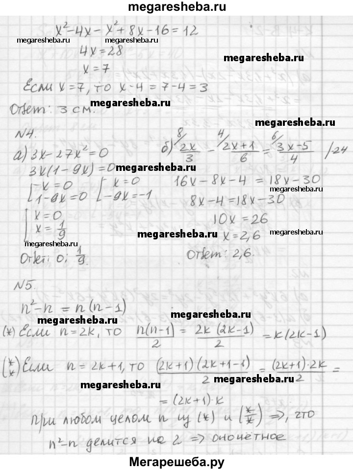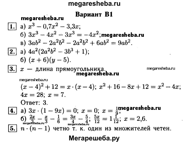 Вариант В1 1. Выполните действия: а) (x3+1,3x2 -2х)-(1,3х +2х2); б) 4х(0,75х2 - х) - Зх3; в) (3 - 2a)ab2 - (ab – 3b)2аb. 2. Вынесите общий множитель за скобки: а) 8а4b2 - 12а2b3 + 4а2; б) х(у - 5) - 6(5 - у). 3. Длину прямоугольника уменьшили на 4 см и получили квадрат, площадь которого меньше площади прямоугольника на 12 см2. Найдите сторону квадрата. 4. Решите уравнения: а) Зх - 27х2 = 0; б) 2x/3 – 2x+1/6= 3x – 5/4. 5. Докажите, что при целом n число n2 - n четно.