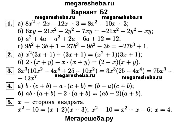 Вариант Б2 1. Упростите выражения: а) (2х – 3)(4x+ 1); б) (Зх - у)(2у - 7х); в) а(а + 4) - (а - 2)(а + 6); г) (1 - Зb)(9b2 + 3b + 1). 2. Разложите на множители: а) Зx3 + x2 + 3x + 1 б) 2x + 2у – x3 - xy 3. Докажите тождество: Зx ( 2x2+5)(5-2x2)=75x3 – 12x7. 4. Представьте в виде произведения: а) cb - ab - са + b2; б) а2b -2b + ab2 - 2а. 5. Сторона квадрата на 2 см меньше одной из сторон прямоугольника и на 3 см больше другой. Найдите сторону квадрата, если его площадь на 10 см2 больше площади прямоугольника.