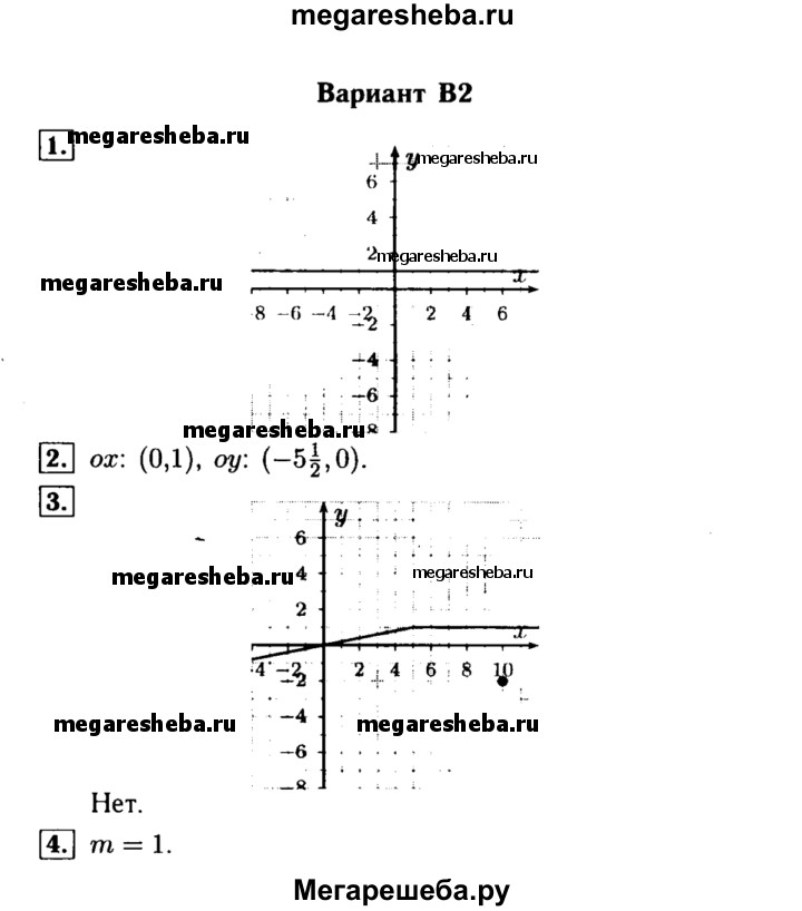 Вариант В2 1. Постройте график функции у = 0,4х + 1. 2. Не выполняя построений, найдите координаты точек пересечения графика функции у = 2(х + 3) - 5 с осями координат. 3. Постройте график функции Проходит ли этот график через точку А(10; -2)? 4. График прямой пропорциональности проходит через точку С. Найдите значение m, при котором он проходит через точку D, если (-4; 8), -2).