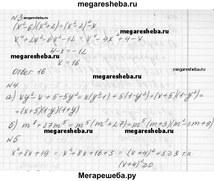 Вариант Б2 1. Упростите выражения: а) -2х(1 - х) + (2х - 3)(х - 1); б) 4(1 + Зх)2 - 24х; в) (х + 4)(х - 4) - (х - З)2. 2. Разложите на множители: а) у - 100у3; б) 7а2 - 14ab + 7b2-, в) 16-у4. 3. Решите уравнение: (х2 - 6)(х2 + 2) = (х2 - 2)2 - х. 4. Представьте в виде произведения: а) ху2 - х + 5 - 5у2; б) m8 + 27m5. 5. Докажите, что при любых значениях х выражение принимает положительные значения: х2 + 8х + 19.