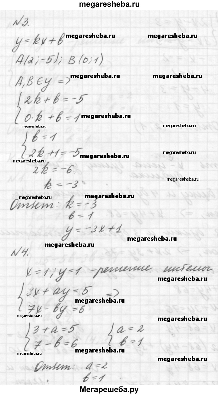 Вариант А2 1. Решите системы уравнений: а){а + b = 7, 5а – 3b = 11; б){2х - у = 3, 3х - у = 5. 2. За 1 булку и 4 бублика заплатили 68 коп., а за 2 булки и 3 бублика — 76 коп. Найдите цену булки и цену бублика. 3. Прямая у =kx +b проходит через точки А и В. Найдите числа k и b и запишите уравнение этой прямой, если А(0; 2), В(3; -1). 4. Найдите значения а и b, при которых решением системы уравнений является пара х = 1, у = 1: {3х + ау = 5, 7х-bу = 6.