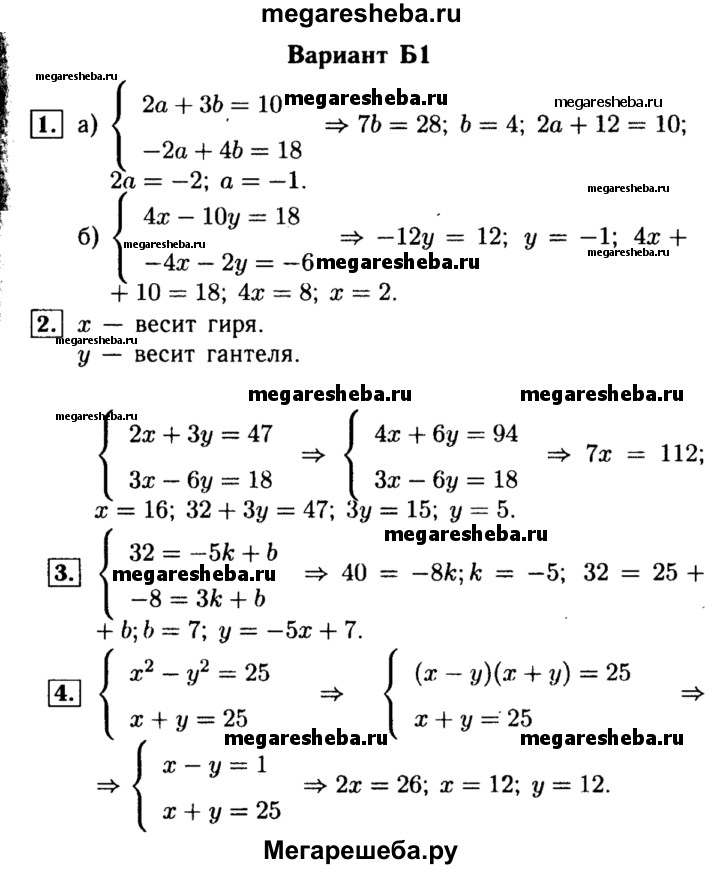 Вариант Б1 1. Решите системы уравнений: а) {2а + 3b = 10, а – 2b = -9; б)2х - 5у = 9, 4х + 2у = 6. 2. 2 гири и 3 гантели весят 47 кг, а 3 гири тяжелее 6 гантелей на 18 кг. Сколько весит гиря и сколько — гантель? 3. График линейной функции проходит через точки А и В. Задайте эту функцию формулой, если: А(-5; 32) и В(3; -8). 4. Разность квадратов двух натуральных чисел равна 25, а сумма этих чисел тоже равна 25. Найдите эти числа.