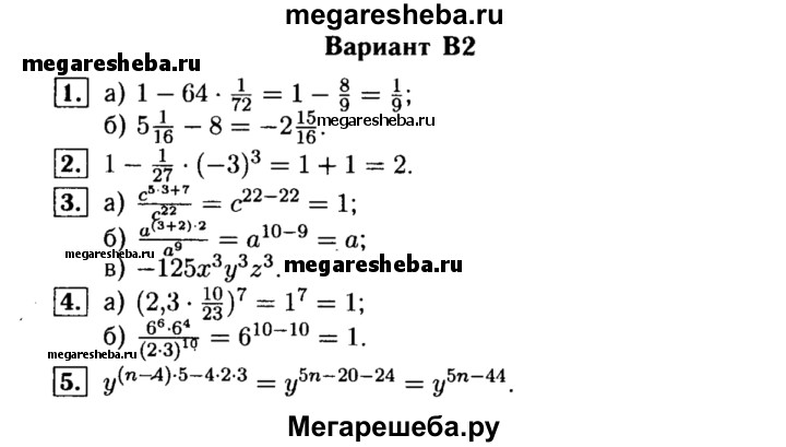 Вариант В2 1. Выполните действия. 2. Найдите значение выражения 1 – 1/27x3 при x = -3. 3.Упростите выражения. 4. Вычислите, используя свойства степени: а) 2,3^7 •(10/23)7 б) 36^3 •6^4 / 2^10 • 3^10 5. Представьте в виде степени с основанием у: (y^n-4)5• ((-y4)2)3.