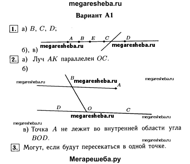 Вариант А1 1. На прямой отмечены точки А, В, С, D. а) Какие из данных точек принадлежат отрезку BD? б) Отметьте на отрезке АС точку Е такую, что Е ∉ АВ. в) Проведите прямую, которая пересекала бы отрезок AD, но не пересекала отрезок АС. 2. Дан угол ВОС и точка А, лежащая в его внутренней области. а) Постройте луч АК, который пересекал бы луч ОВ, но не пересекал бы луч ОС. б) Постройте луч OD так, чтобы угол DOC был развернутым. в) Лежит ли точка А в о внутренней области угла BOD? 3. Каждая из трех прямых а, b, с пересекается с двумя другими. Могут ли эти прямые иметь менее трех точек пересечения?