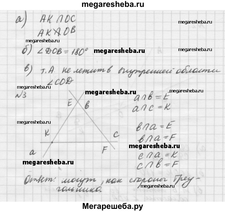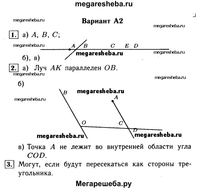 Вариант А2 1. На прямой отмечены точки А, В, С, D. а) Какие из данных точек принадлежат отрезку АС? б) Отметьте на отрезке BD точку F та кую, что F ∉ ВС. в) Проведите прямую, которая пересекала бы отрезок AD, но не пересекала отрезок BD. 2. Дан угол ВОС и точка А, лежащая в его внутренней области. а) Постройте луч АК, который пересекал луч ОС, но не пересекал луч ОВ. б) Постройте луч OD так, чтобы угол DOB был развернутым. в) Лежит ли точка А в о внутренней области угла COD? 3. Каждая из трех прямых а, b, с пересекается с двумя другими. Могут ли эти прямые иметь более одной точки пересечения? Ответ объясните.