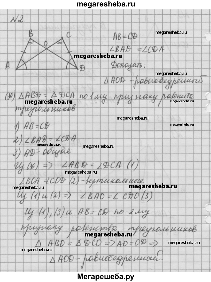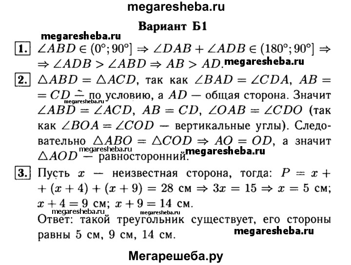 Вариант Б1 1. Отрезок BD - биссектриса треугольника ABC. Докажите, что АВ > AD. 2. На данном рисунке АВ = CD, ∠BAD = ∠CDA. Докажите, что треугольник AOD равнобедренный. 3. Определите, существует ли треугольник с периметром 28 см, в котором одна из сторон меньше другой на 4 см и меньше третьей на 9 см.