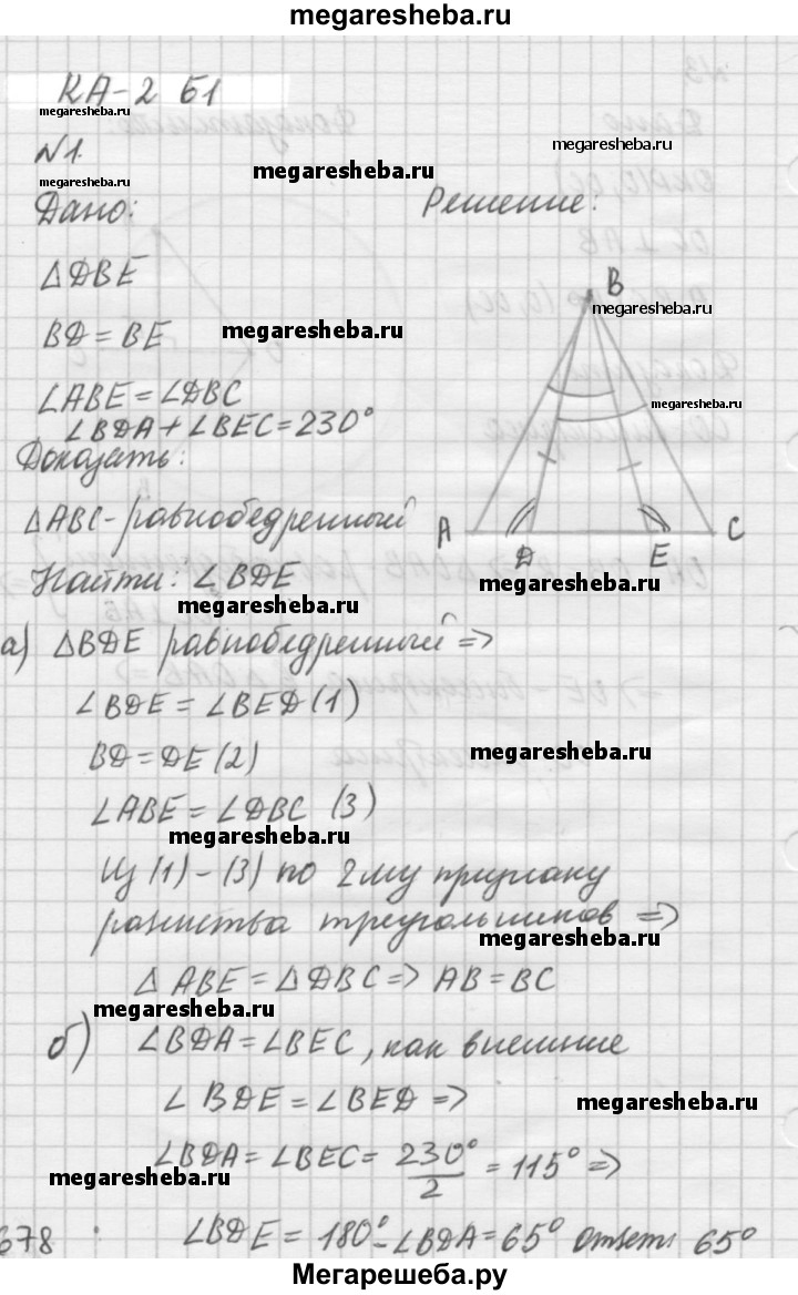 Вариант Б1 1. На данном рисунке треугольник DBE равнобедренный с основанием DE, ∠ABE = ∠DBC а) Докажите, что треугольник АБС равнобедренный. б) Найдите ∠BDE, если сумма углов BDA и ВЕС равна 230°. 2. Дан отрезок АС. Постройте его середину - точку D. Постройте точку В такую, чтобы отрезок BD был равен отрезку АС и являлся биссектрисой равнобедренного треугольника ABC. 3. Докажите, что если в треугольнике два угла равны, то биссектрисы, проведенные из вершин этих углов, также равны.