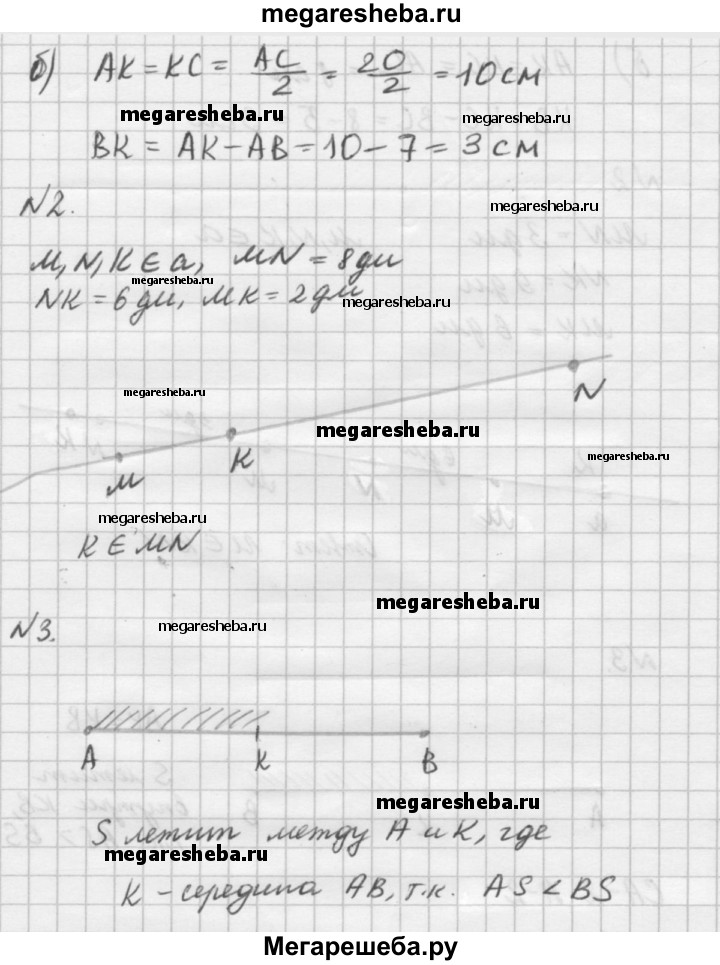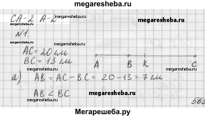 Вариант А2 1. На отрезке АС отмечена точка В. Известно, что АС = 20 см, ВС = 13 см. а) Сравните длины отрезков АВ и ВС. б) Найдите расстояние от точки В до середины отрезка АС. 2. На прямой отмечены точки М, N, К так, что MN = 8 дм, NK = 6 дм, МК = 2 дм. Какая из трех точек лежит между двумя другими? 3. Отметьте ту часть отрезка А В, где может располагаться точка S, если AS < BS.