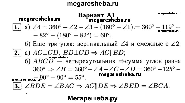 Вариант А1 1. На данном рисунке ∠1 = 82°, ∠2 = 119°, ∠3 = 82°. а) Найдите ∠4. б) Сколько углов, равных ∠4, изображено на рисунке? Отметьте эти углы. Отметьте эти углы. 2. Из точек А и В, лежащих на одной из сторон данного острого угла, проведены перпендикуляры АС и BD ко второй стороне угла. а) Докажите, что АС|| BD. б) Найдите ∠ABD, если ∠CAB = 125°. 3. На сторонах АВ и ВС треугольника ABC отмечены точки D и Е соответственно. Докажите, что если ∠BDE = ∠BAC, то ∠BED = ∠ BCA