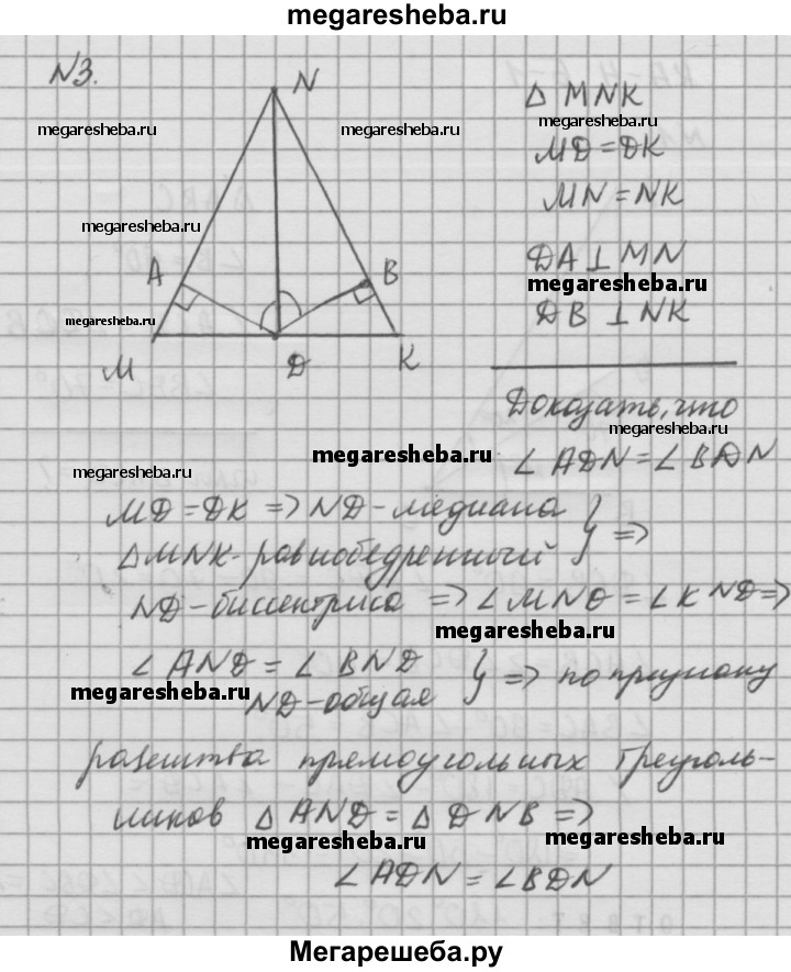 Вариант А2 1. В треугольнике ABC угол С в 2 раза меньше угла В, а угол В на 45° больше угла А. а) Найдите углы треугольника. б) Сравните стороны АВ и ВС. 2. В прямоугольном треугольнике ABC с гипотенузой АВ внешний угол при вершине В равен 150°, АС + АВ = 12 см. Найдите длину гипотенузы треугольника. 3. В равнобедренном треугольнике MNK точка D - середина основания МК, DA и DB - перпендикуляры к боковым сторонам. Докажите, что ∠ADN = ∠BDN.