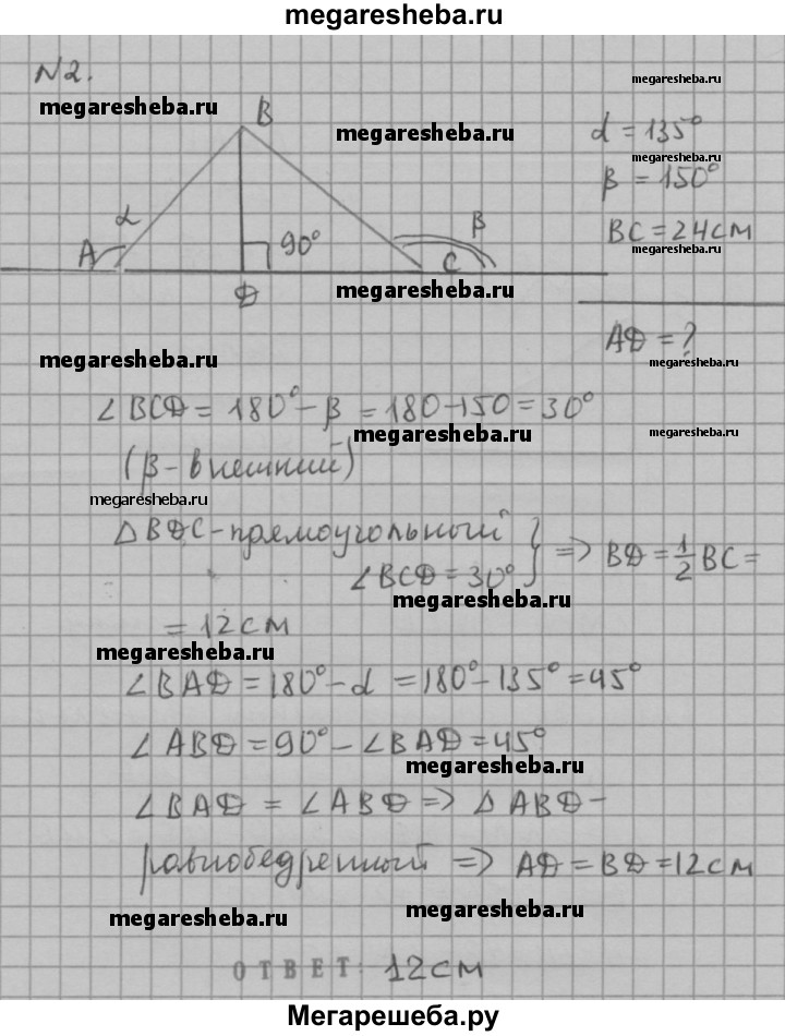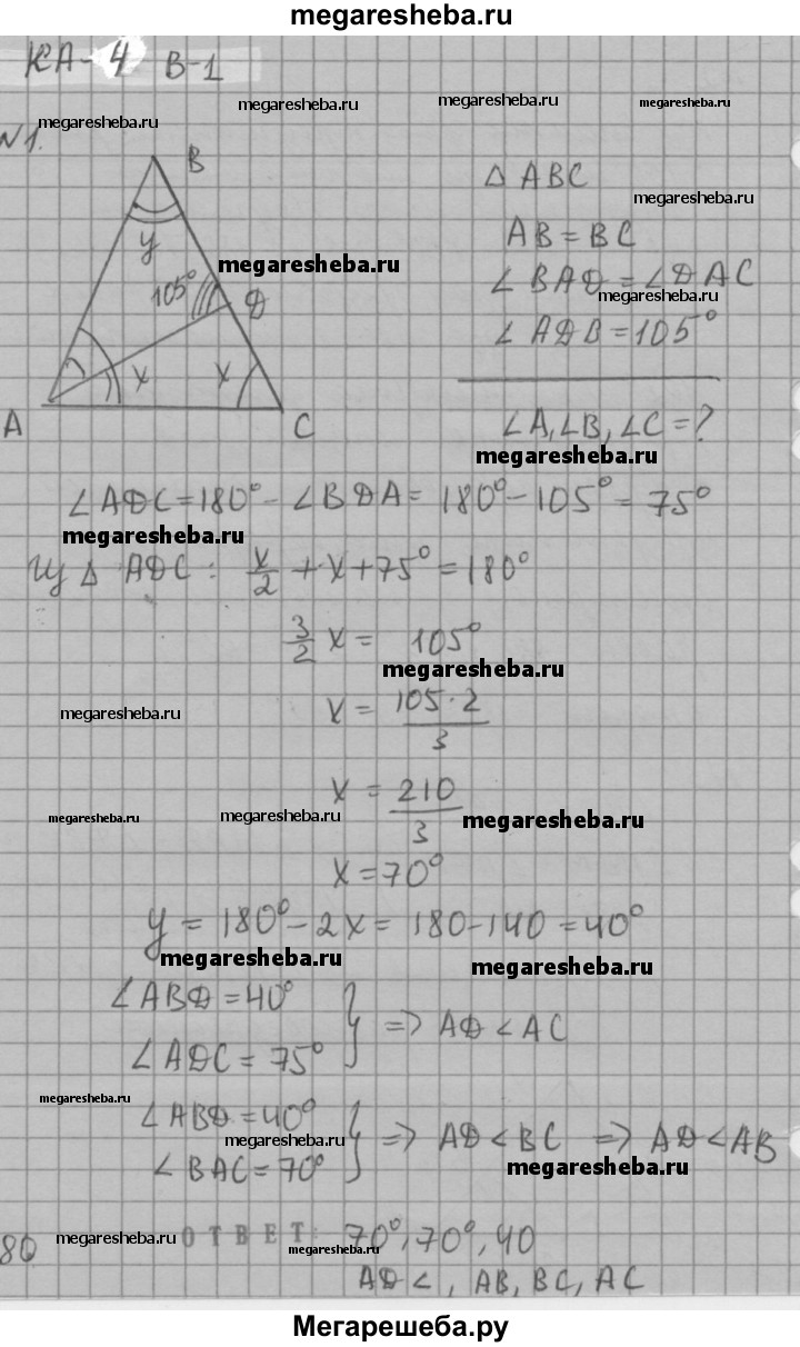 Вариант В1 1. В равнобедренном треугольнике ABC основание АС меньше боковой стороны. Биссектриса AD образует со стороной ВС углы, один из которых равен 105°. а) Найдите углы треугольника ABC. б) Сравните отрезок AD со сторонами треугольника ABC. 2. В треугольнике ABC BD - высота. Внешние углы треугольника при вершинах А и С равны 135° и 150° соответственно. Найдите длину отрезка AD, если ВС = 24 см. 3. В прямоугольном треугольнике MNK с гипотенузой NK проведены биссектриса KD и перпендикуляр DE к гипотенузе. Докажите, что если MN = 3 MD, то NE = ЕК.