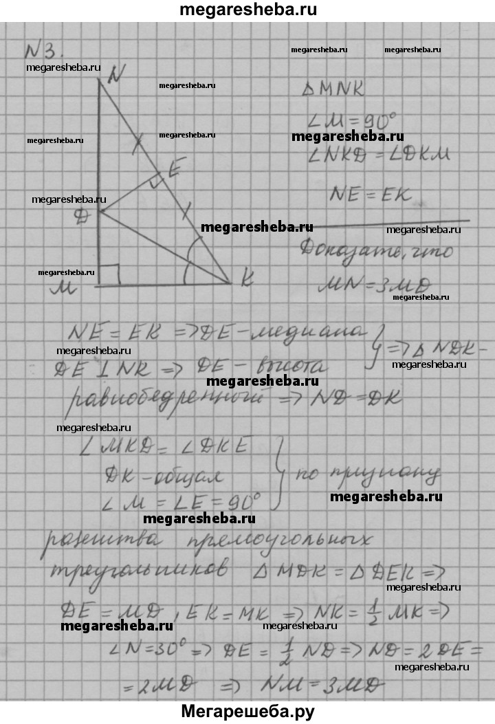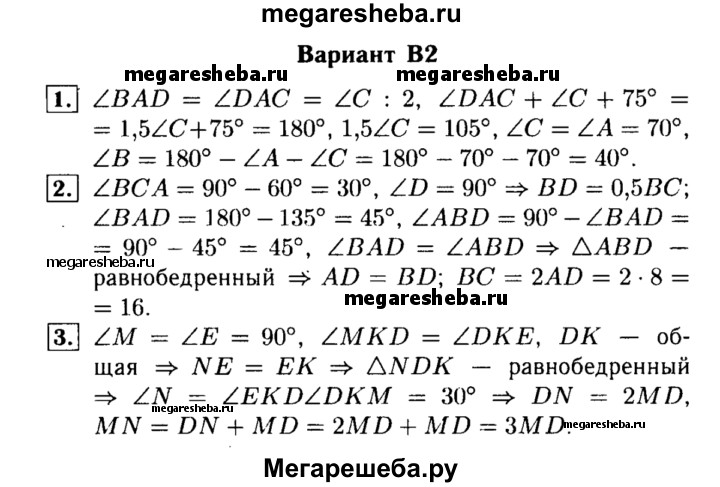 Вариант В1 1. В равнобедренном треугольнике ABC основание АС меньше боковой стороны. Биссектриса AD образует со стороной ВС углы, один из которых равен 105°. а) Найдите углы треугольника ABC. б) Сравните отрезок AD со сторонами треугольника ABC. 2. В треугольнике ABC BD - высота. Внешние углы треугольника при вершинах А и С равны 135° и 150° соответственно. Найдите длину отрезка AD, если ВС = 24 см. 3. В прямоугольном треугольнике MNK с гипотенузой NK проведены биссектриса KD и перпендикуляр DE к гипотенузе. Докажите, что если MN = 3 MD, то NE = ЕК.