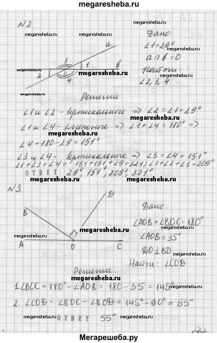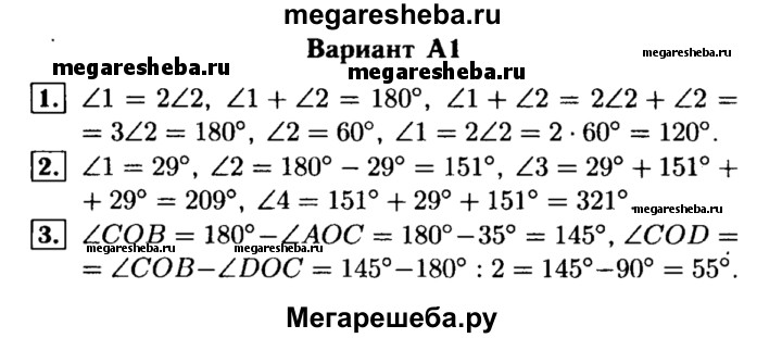 Вариант А1 1. Один из смежных углов в 2 раза больше другого. Найдите эти углы. 2. Найдите все неразвернутые углы, образовавшиеся при пересечении двух прямых, если один из них равен 29°. 3. Углы АОВ и ВОС — смежные. Луч DO перпендикулярен к лучу ВО и делит угол ВОС на два угла. Найдите ∠COD, если ∠AOB = 35°.