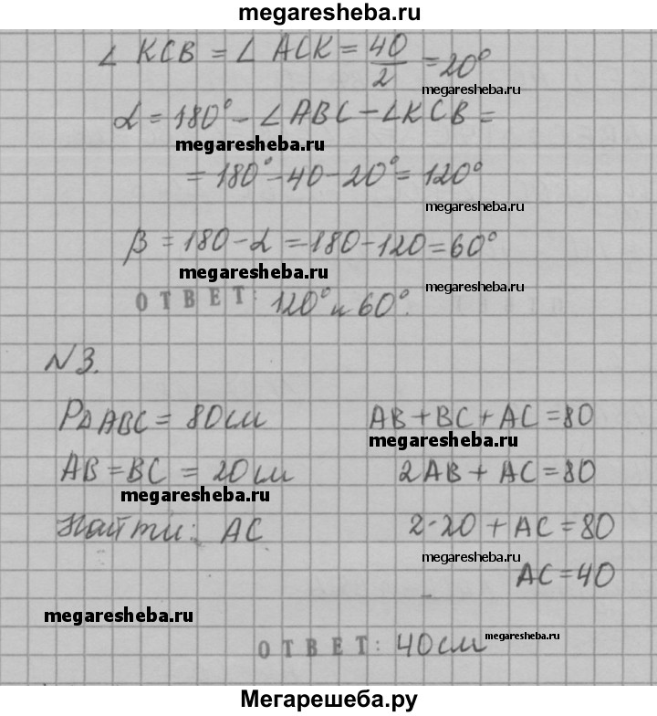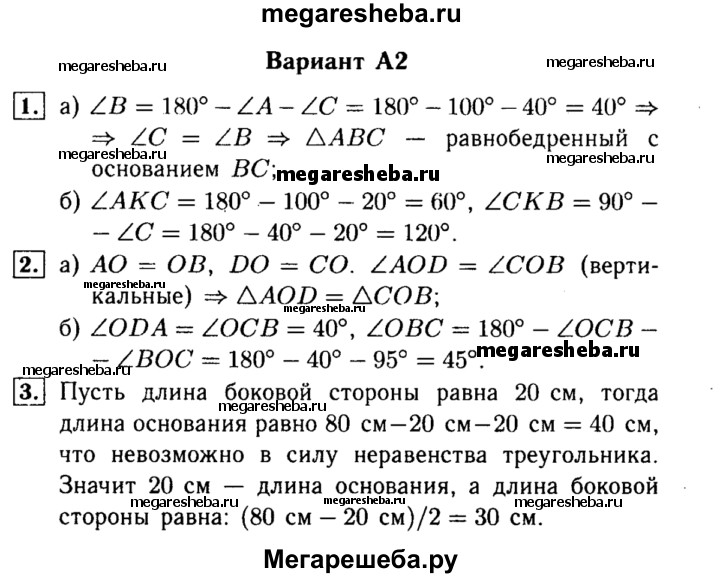 Вариант А2 1. В треугольнике ABC ∠A = 100°, ∠C = 40°. а) Докажите, что треугольник АБС - равнобедренный, и укажите его боковые стороны. б) Отрезок СК - биссектриса данного треугольника. Найдите углы, которые она образует со стороной АВ. 2. Отрезки АВ и CD пересекаются в точке О, которая является серединой каждого из них. а) Докажите, что ΔAOD = ΔВОС. б) Найдите ∠OBC, если ∠ODA = 40°, ∠BOC = 95°. 3. В равнобедренном треугольнике с периметром 80 см одна из сторон равна 20 см. Найдите длину основания треугольника.