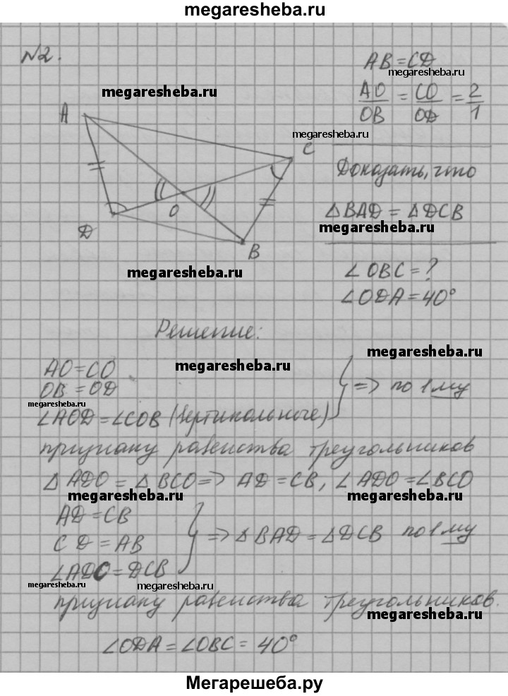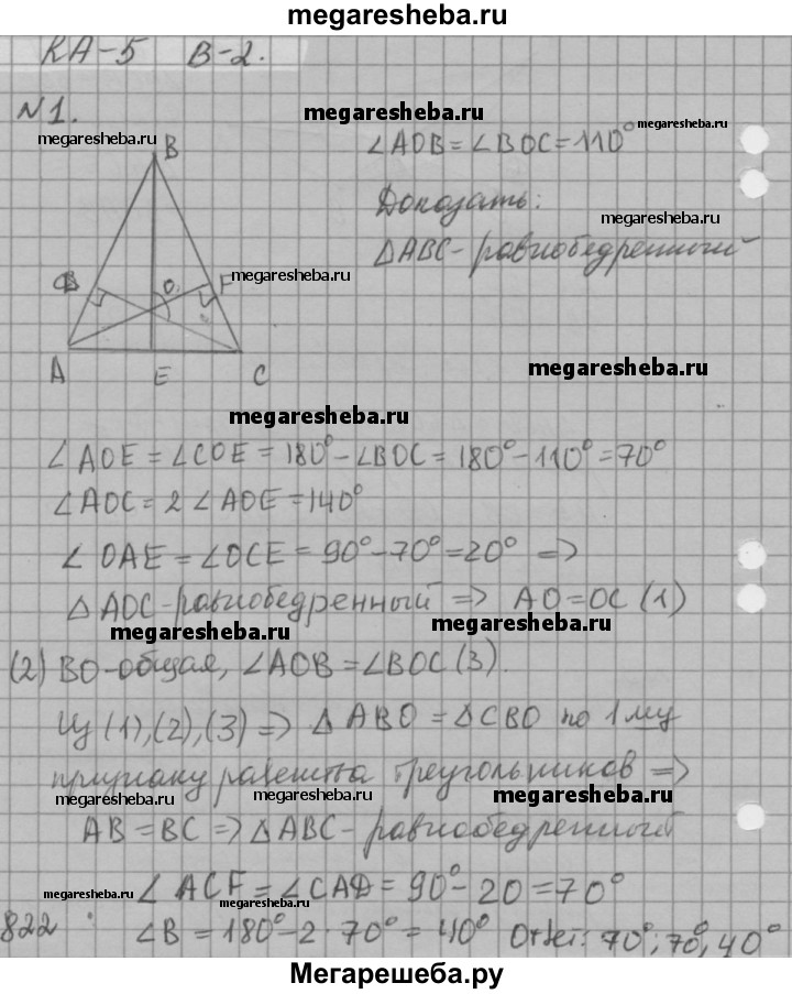 Вариант В2 1. Высоты треугольника ABC пересекаются в точке О, причем ∠АОВ = ∠BOC = 110⁰. а) Докажите, что треугольник ABC равнобедренный, и укажите его боковые стороны. б) Найдите углы данного треугольника. 2. Равные отрезки АВ и CD точкой пересечения О делятся в отношении АО:ОВ = CO:OD = 2:1. а) Докажите равенство треугольников BAD и DCВ. б) Найдите ∠OBC, если ∠ODA = 40°. 3. Гипотенуза прямоугольного треугольника равна 26 см. Может ли высота, проведенная к гипотенузе, иметь длину 14 см? Ответ объясните.