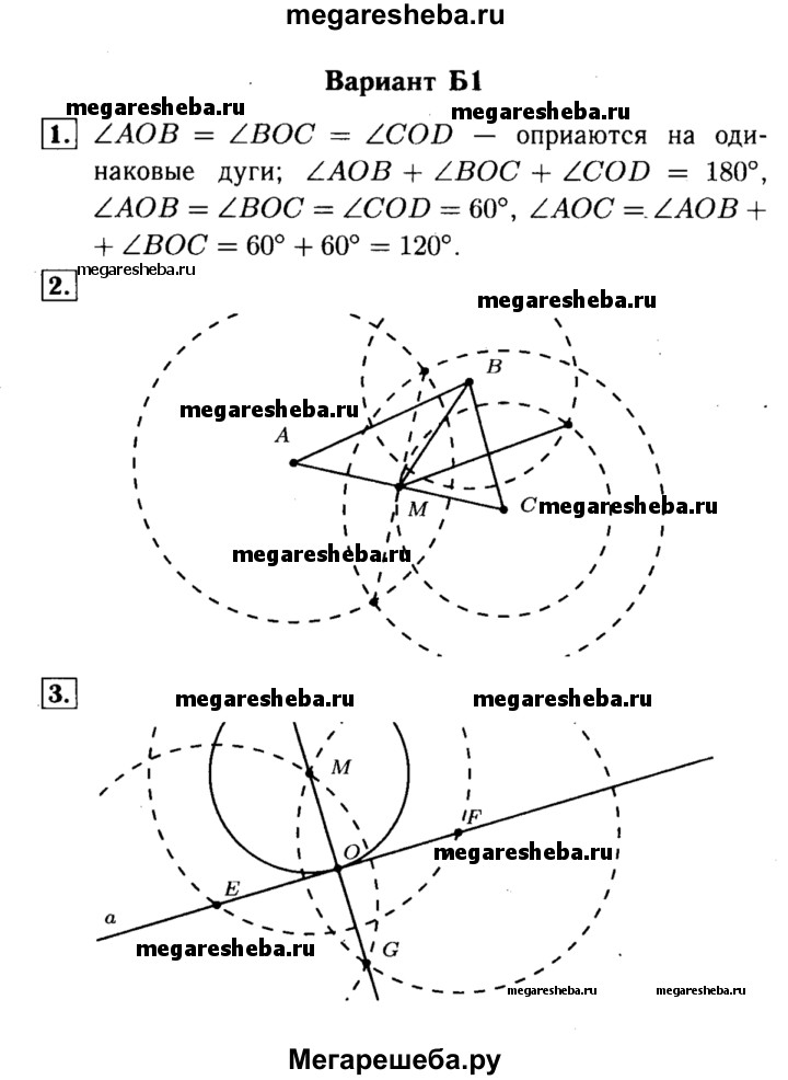 Вариант Б1 1. Отрезок AD — диаметр окружности с центром в точке О. На окружности отмечены точки В и С так, что хорды АВ, ВС и CD равны. Найдите величину угла АОС. 2. Дан произвольный треугольник ABC. Постройте его медиану ВМ. Постройте биссектрису угла ВМС. 3. Дана прямая а и точка М, не лежащая на ней. Постройте прямую, проходящую через точку М и перпендикулярную к прямой а. Постройте окружность с центром в точке М, имеющую с прямой а одну общую точку.