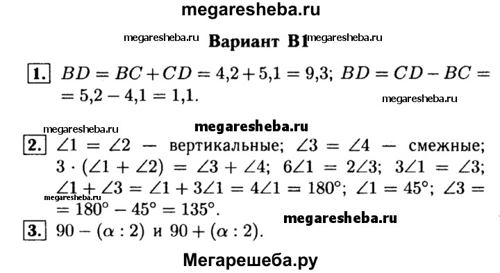 Вариант В1 1. На прямой отмечены точки В, С и D. Какую длину может иметь отрезок BD, если ВС = 4,2 см, CD = 5,1 см? 2. Найдите все углы, образовавшиеся при пересечении двух прямых, если сумма двух из них в 3 раза меньше суммы двух других. 3. Из вершины угла, равного а, проведен луч, перпендикулярный биссектрисе угла. Какие углы образует этот луч со сторонами данного угла?