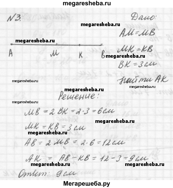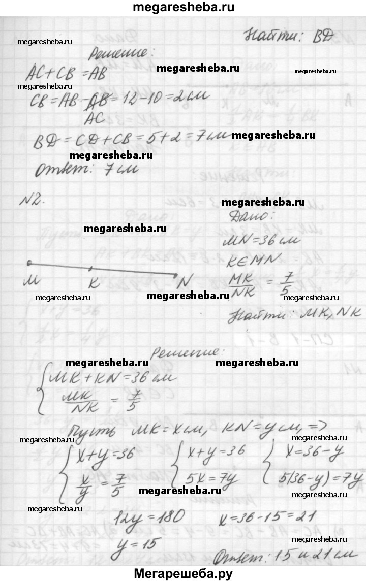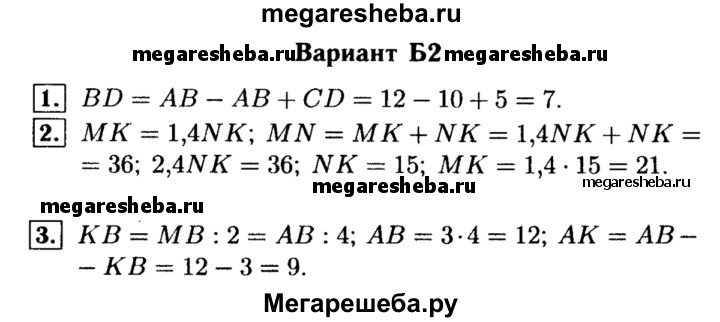 Вариант Б2 1. На отрезке АВ длиной 12 см выбрана точка С так, что АС = 10 см, и точка D так, что CD = 5 см. Найдите длину отрезка BD. 2. На отрезке MN длиной 36 см выбрана точка К. Найдите длины отрезков МК и NK, если MK-.NK = 7:5. 3. Точка М — середина отрезка АВ, точка К — середина отрезка MB. Найдите длину отрезка АК, если В К = 3 см.