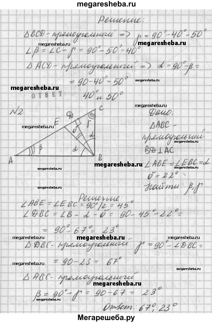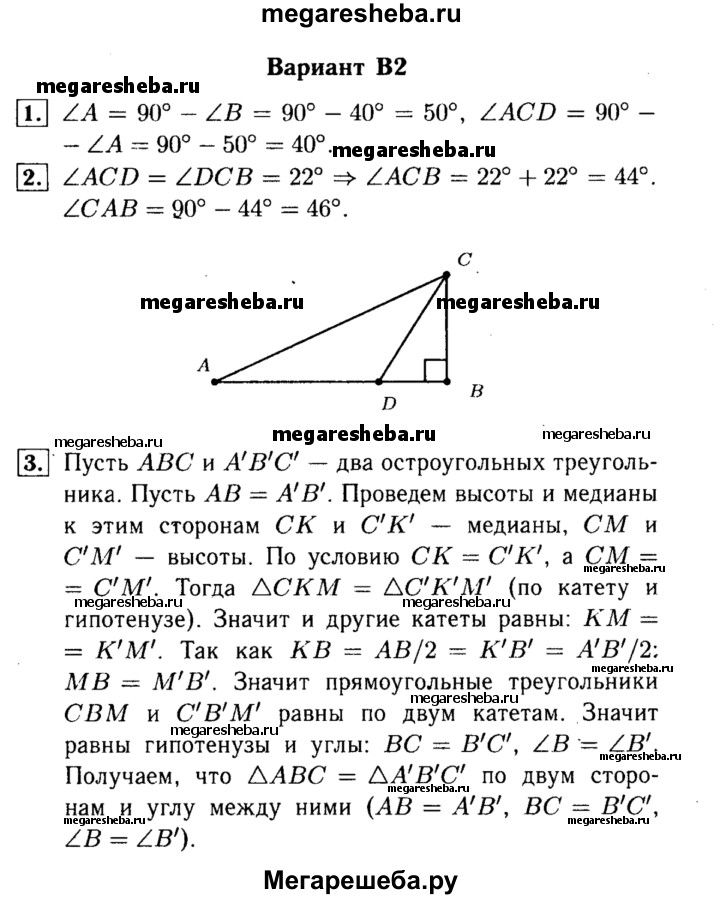 Вариант В2 1. Дано: ∠АС В = 90°; ∠B = 40°. Найти: острые углы треугольника ACD. 2. Угол между биссектрисой и высотой, проведенными из вершины наибольшего угла прямоугольного треугольника, равен 22°. Найдите острые углы данного треугольника. 3. Докажите равенство остроугольных треугольников по стороне и проведенным к ней медиане и высоте.