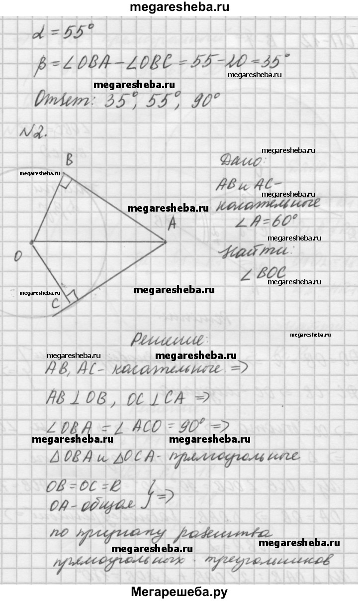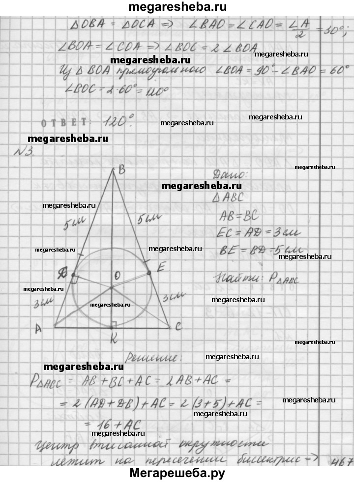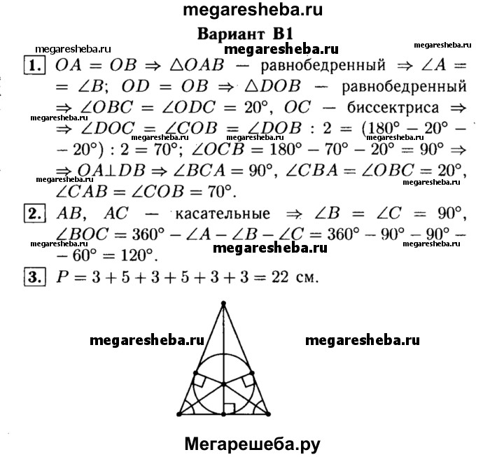 Вариант В1 1. Дано: ВС = CD; ∠ОВС = 20°. Найти: углы треугольника ABC. 2. Дано: АВ и АС — касательные; ∠А = 60°. Найти: ∠ВОС. 3. Точка касания вписанной окружности делит боковую сторону равнобедренного треугольника на отрезки 3 см и 5 см, считая от основания. Найдите периметр треугольника.
