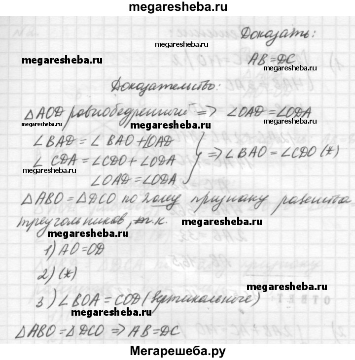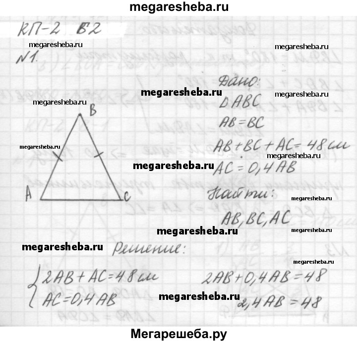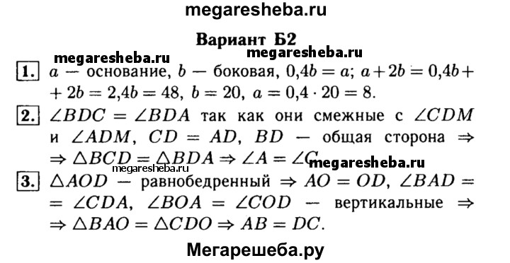 Вариант Б2 1. Периметр равнобедренного треугольника равен 48 см. Найдите стороны этого треугольника, если его основание составляет 0,4 боковой стороны. 2. Дано: CD=AD; ∠CDM = ∠ADM. Доказать: ∠A = ∠C. 3. ΔAOD — равнобедренный; ∠BAD = ∠CDA. Доказать: AB = DC.