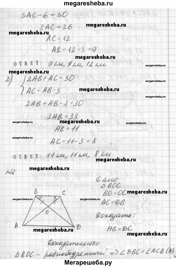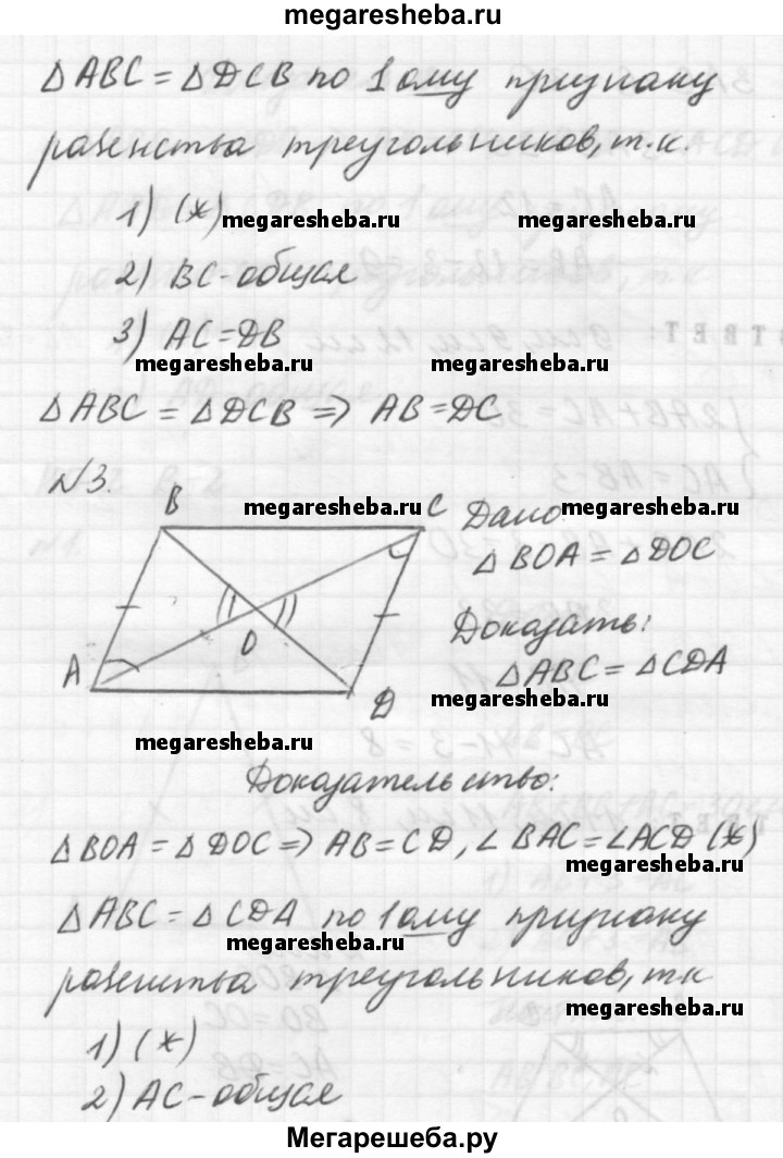 Вариант B2 1. Периметр равнобедренного треугольника равен 30 см. Какими могут быть стороны треугольника, если одна из них на 3 см меньше другой? 2. Дано: ΔВОС — равнобедренный; АС = DB. Доказать: АВ = DC. 3. Дано: ΔBOA = ΔDOC. Доказать: ΔABC = ΔCDA.