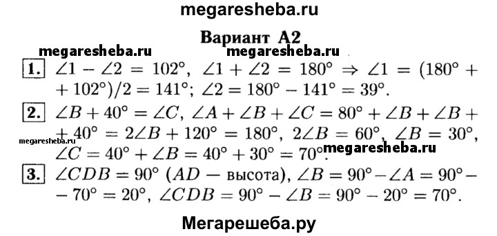 Вариант А2 1. Дано: а || b; с — секущая; ∠1— ∠2 = 102°. Найти все образовавшиеся углы. 2. В треугольнике ABC угол А равен 80°, а угол С на 40° больше угла В. Найдите углы В и С. 3. В треугольнике ABC угол С равен 90°, угол А равен 70°, CD - биссектриса. Найдите углы треугольника BCD.