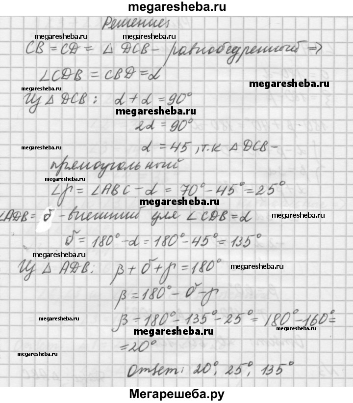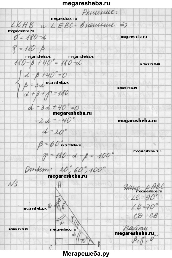 Вариант В1 Дано: a||b; c - секущая; ∠3 больше суммы ∠1+ ∠2 в 4 раза. Найти: все образовавшиеся углы. 2. В треугольнике ABC угол А меньше угла В в 3 раза, а внешний угол при вершине А больше внешнего угла при вершине В на 40°. Найдите внутренние углы треугольника ABC. 3. В треугольнике ABC угол С равен 90°, а угол В равен 70°. На катете АС отложен отрезок CD, равный СВ. Найдите углы треугольника ABD.
