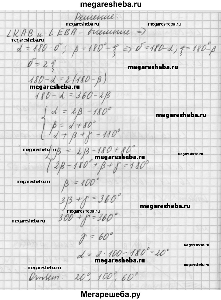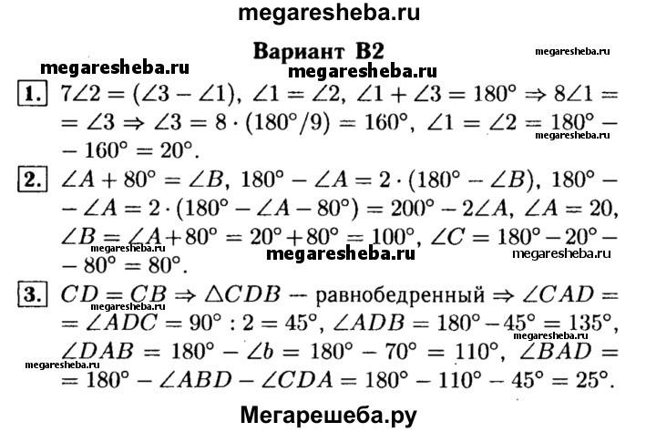 Вариант В2 1. Дано: a||b; c - секущая; ∠2 меньше разности ∠3 - ∠1 в 7 раз. Найти: все образовавшиеся углы. 2. В треугольнике ABC угол А меньше угла В на 80°, а внешний угол при вершине А больше внешнего угла при вершине В в 2 раза. Найдите внутренние углы треугольника ABC. 3. В треугольнике ABC угол С равен 90°, а угол В равен 70°. На луче СВ отложен отрезок CD, равный СА. Найдите углы треугольника ABD.
