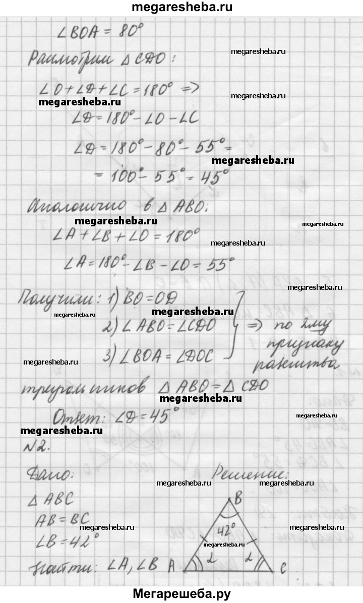 Вариант А1 1. Дано: ВО = DO; ∠AВС = 45°; ∠BCD = 55°; ∠АОС = 100°. Найти: ∠D. Доказать: ΔABO = ΔCDO. 2. В равнобедренном треугольнике ABC с основанием АС угол В равен 42°. Найдите два других угла треугольника ABC. 3. Точки В и D лежат в разных полуплоскостях относительно прямой АС. Треугольники ABC и ADC равносторонние. Докажите, что АВ || CD.