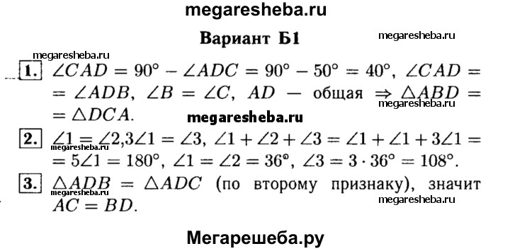 Вариант Б1 1. Дано: ∠B = ∠C = 90°; ∠ADC = 50°; ∠ADB = 40°. Доказать: ΔABD = ΔDCA. 2. В равнобедренном треугольнике угол между боковыми сторонами в 3 раза больше угла при основании. Найдите углы треугольника. 3. Параллельные прямые а и b пересечены двумя параллельными секущими АВ и CD, причем точки А и С принадлежат прямой а, а точки В и D — прямой b. Докажите, что АС = BD.