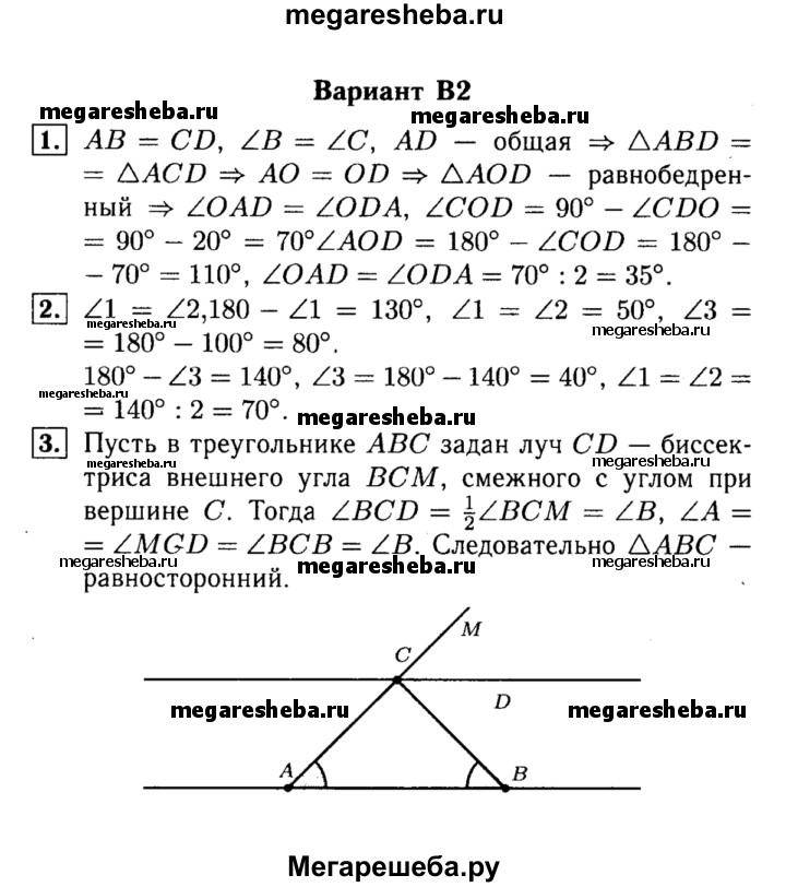 Вариант В2 1. Дано: ∠В = ∠С = 90°; АВ = DC; ∠С DO = 20°. Найти: углы треугольника AOD. 2. В равнобедренном треугольнике один из внешних углов равен 130°. Какими могут быть углы треугольника? 3. Докажите, что если биссектриса внешнего угла треугольника параллельна одной из его сторон, то этот треугольник равнобедренный.