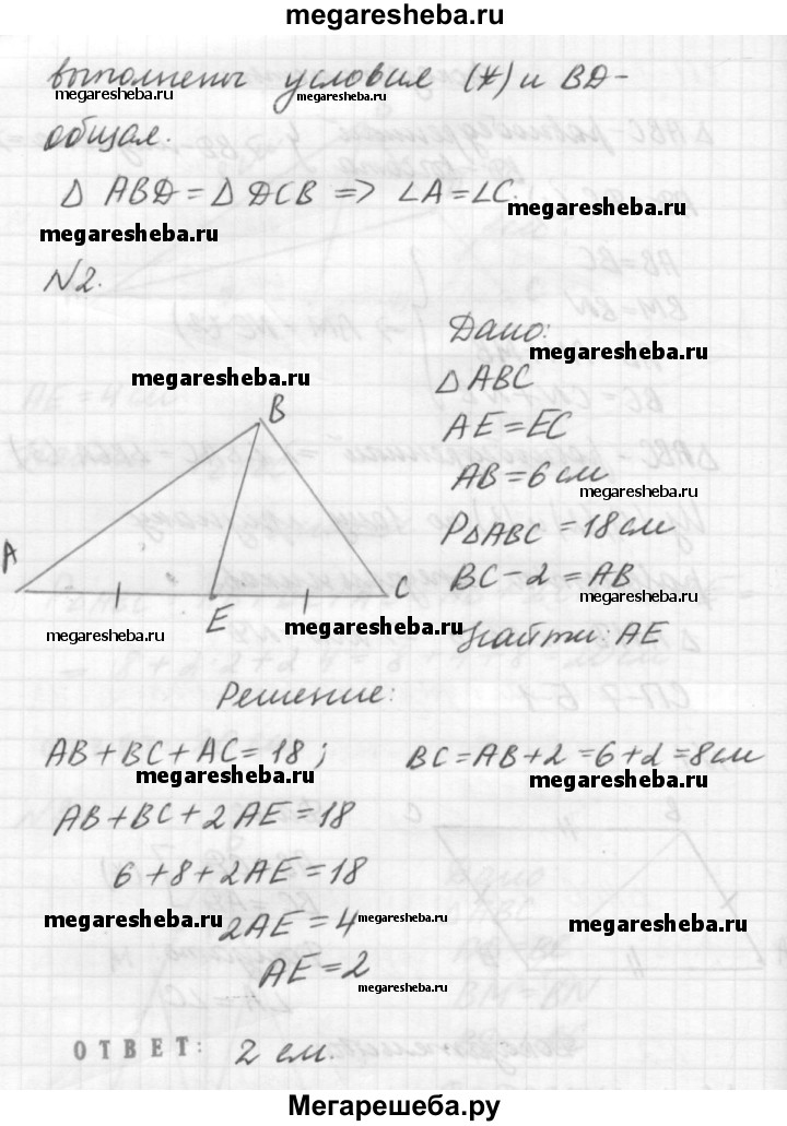 Вариант Б1 1. Дано: АВ = CD; ВС = AD. Доказать: ∠А = ∠С. 2. В треугольнике ABC проведена медиана BE. Найдите длину АЕ, если АВ = 6 см, периметр треугольника А ВС равен 18 см, ВС на 2 см больше АВ. 3. На боковых сторонах равнобедренного треугольника ABC с основанием АС отложены равные отрезки AM и CN. BD - медиана треугольника ABC - пересекает отрезок MN в точке О. Докажите, что ВО - медиана треугольника MBN.