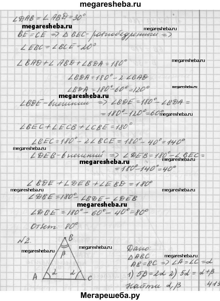 Вариант В2 1. Дано: AD = BD; BE = CE. ∠А = 30°; ∠C = 20°. Найти: ∠DBE. 2. Какими могут быть углы равнобедренного треугольника, если один из них в 5 раз меньше суммы двух других? 3. Один из углов треугольника равен разности двух других. Докажите, что данный треугольник прямоугольный.